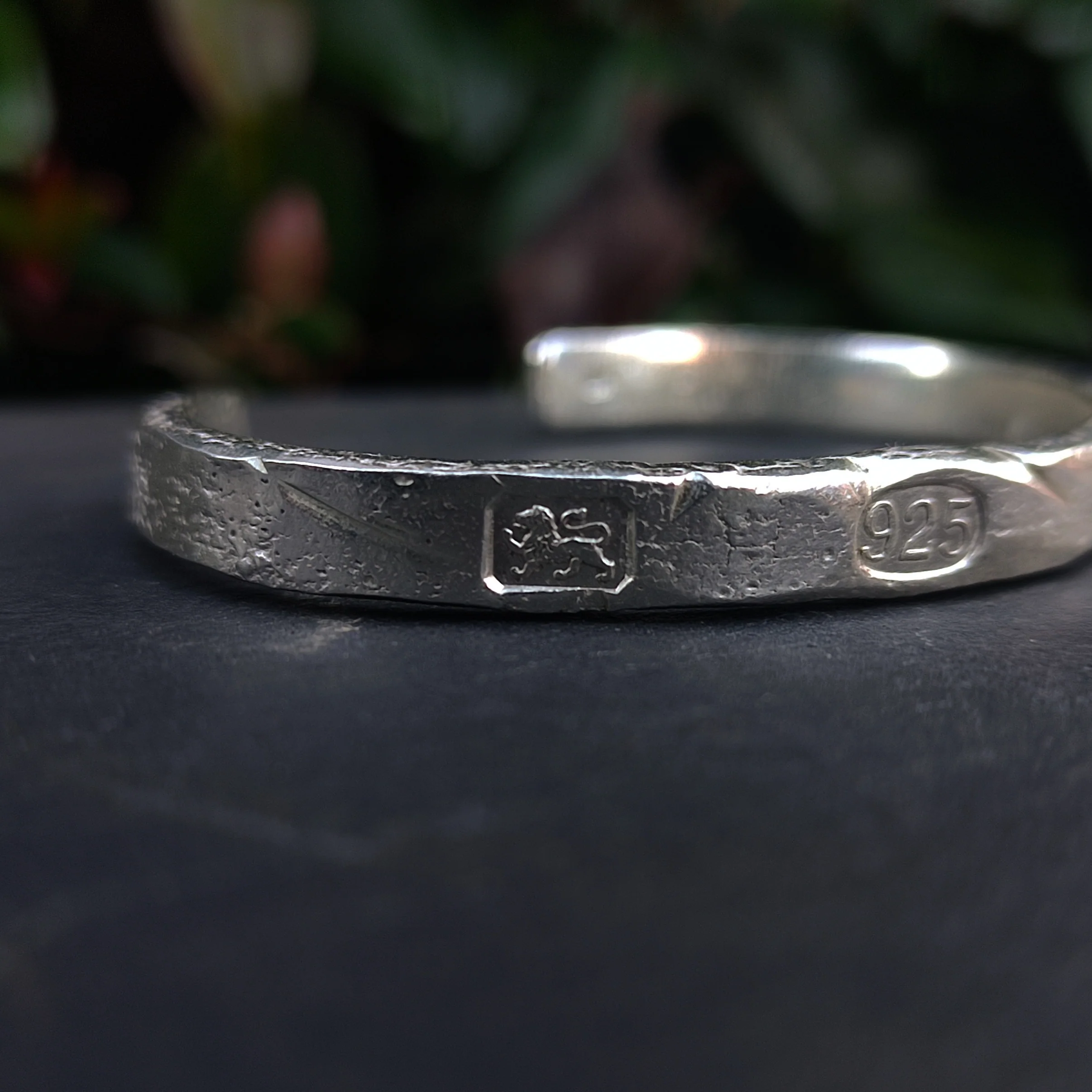 This mid/heavy-weight cuff bracelet features a unique molten rock texture, with distressed faceted surfaces that catch the light in every situation