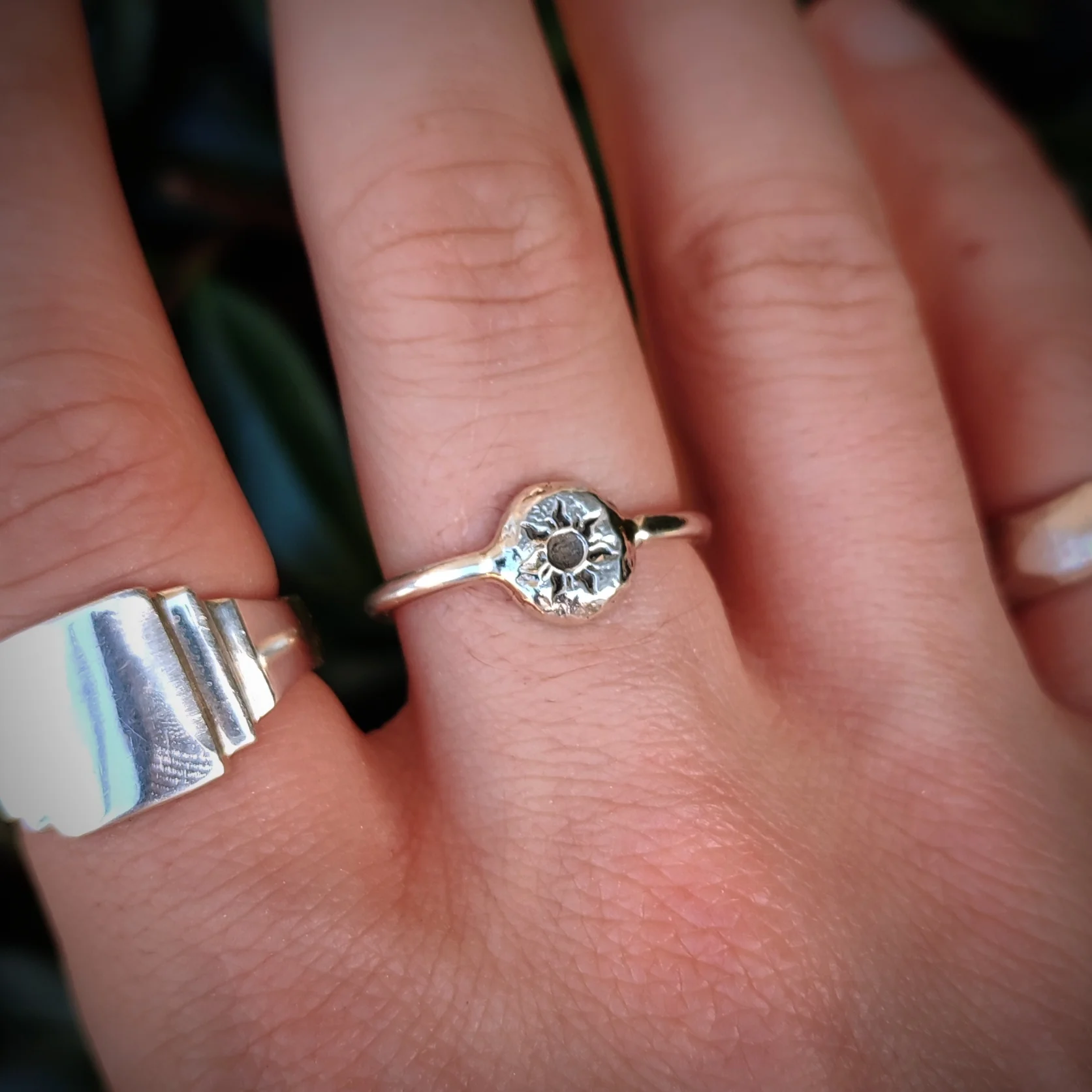 Because each signet face is individually melted and shaped, the size and outline of the sun feature will vary slightly, ensuring your ring is a truly unique piece of artisan jewellery.