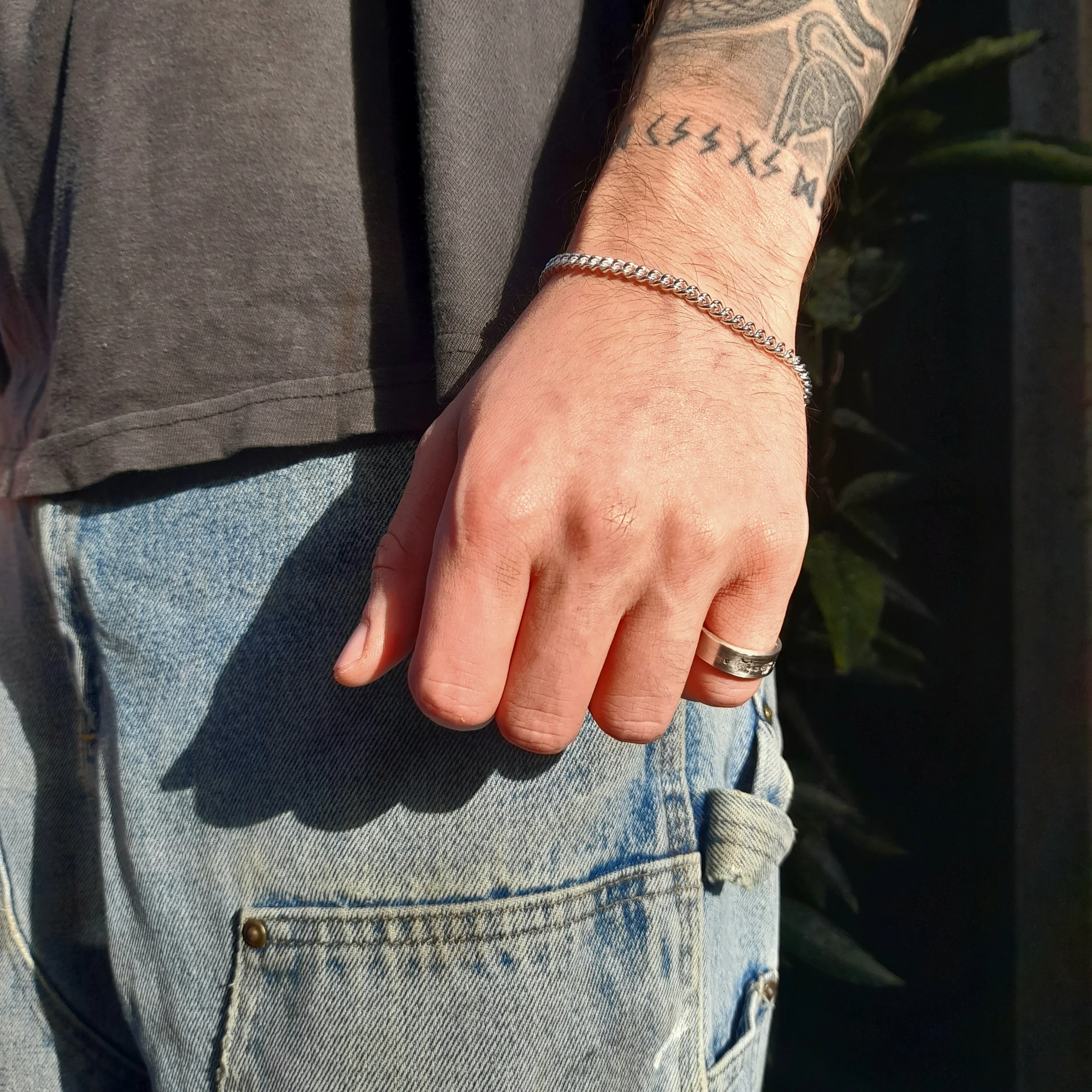 This silver curb bracelet is crafted from solid 925 sterling silver and designed with classic curved curb links. With a 4mm width and medium thickness, the bracelet has a comfortable weight that feels substantial without being heavy.
