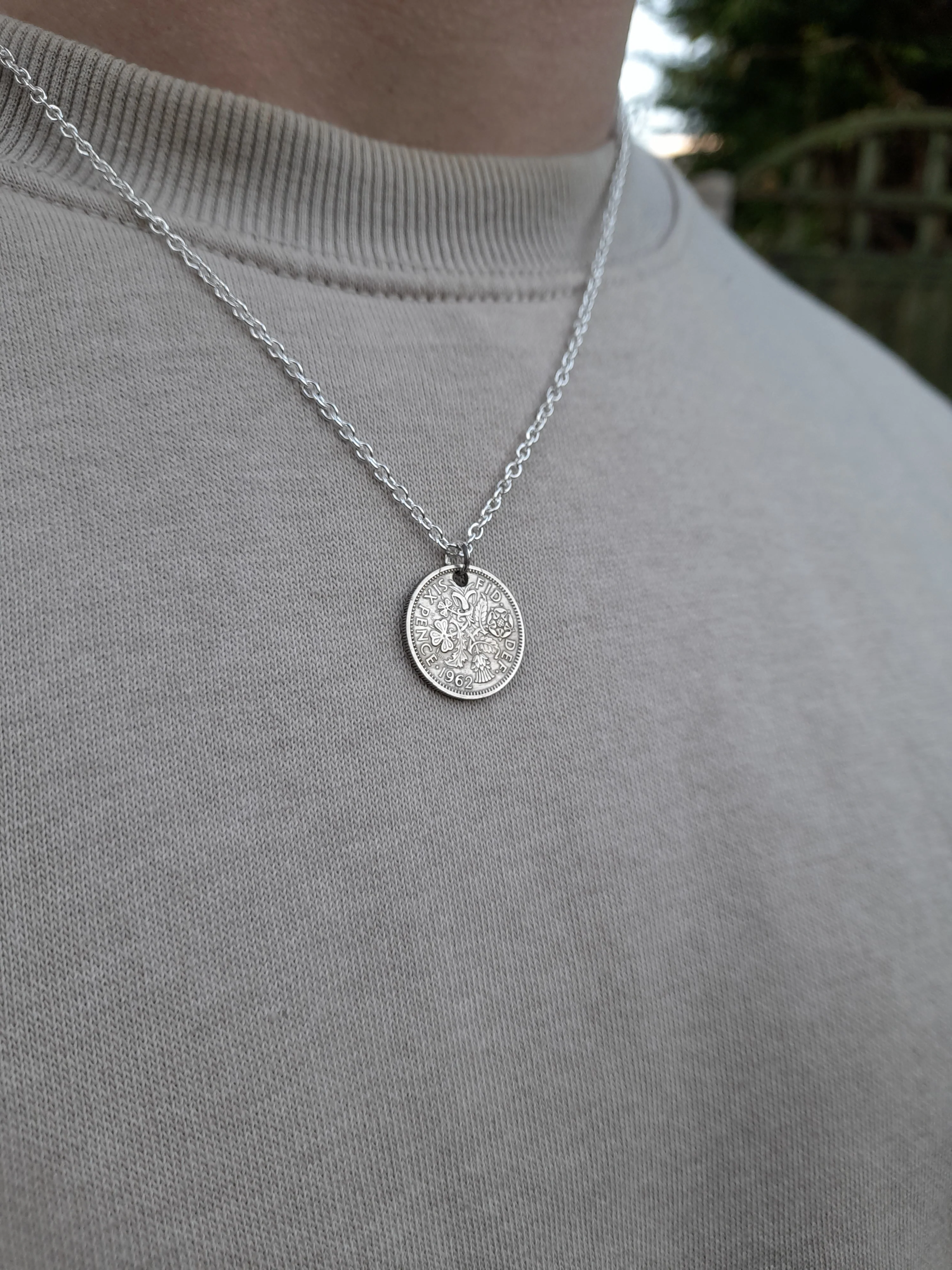 Each sixpence pendant is handmade, meaning subtle variations in surface detail and finish should be expected.