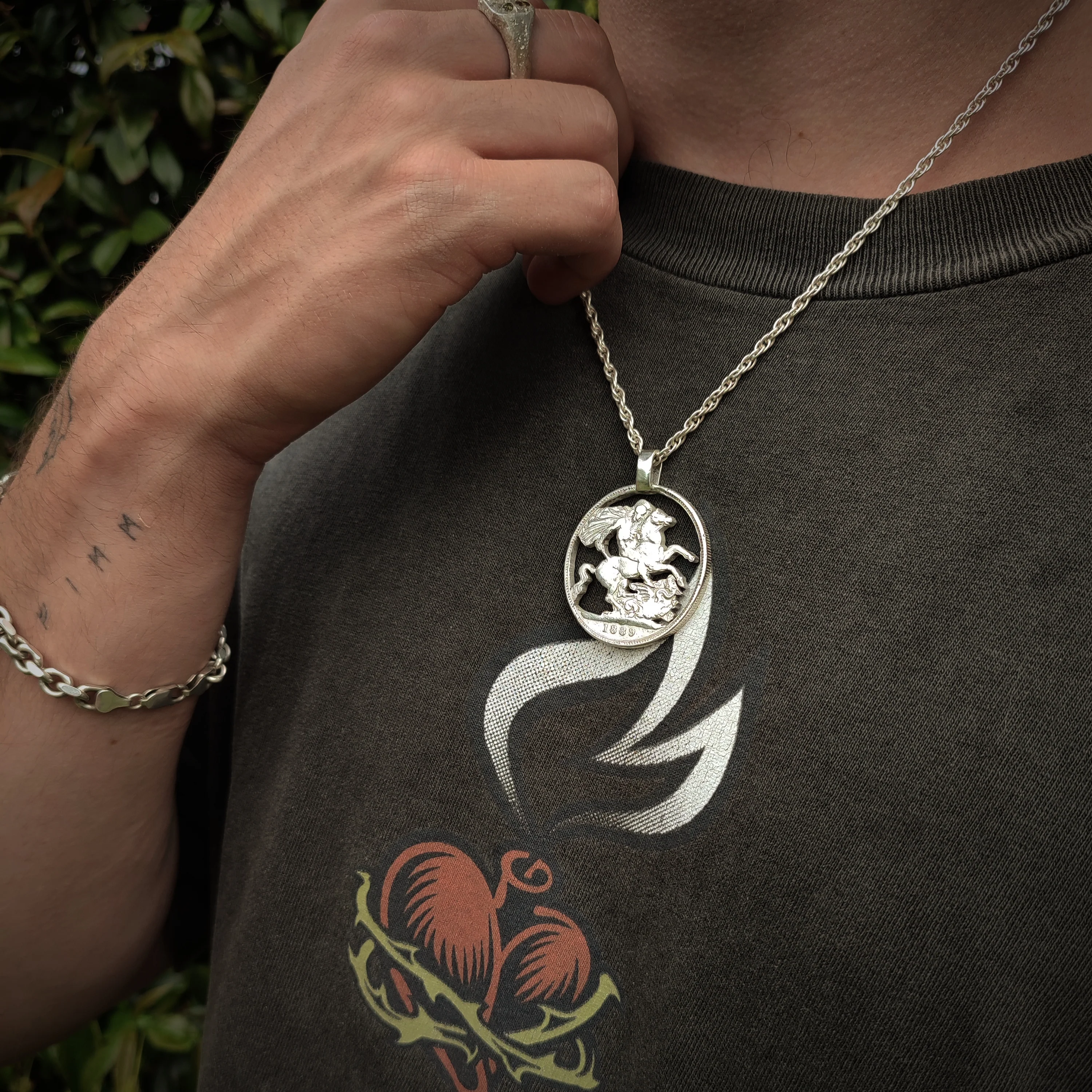 This heavy sterling silver pendant features the legendary image of Saint George slaying the dragon. Handcrafted from a genuine Victorian sterling silver Crown coin dating back to the 1800s, this piece is a wearable slice of British history.